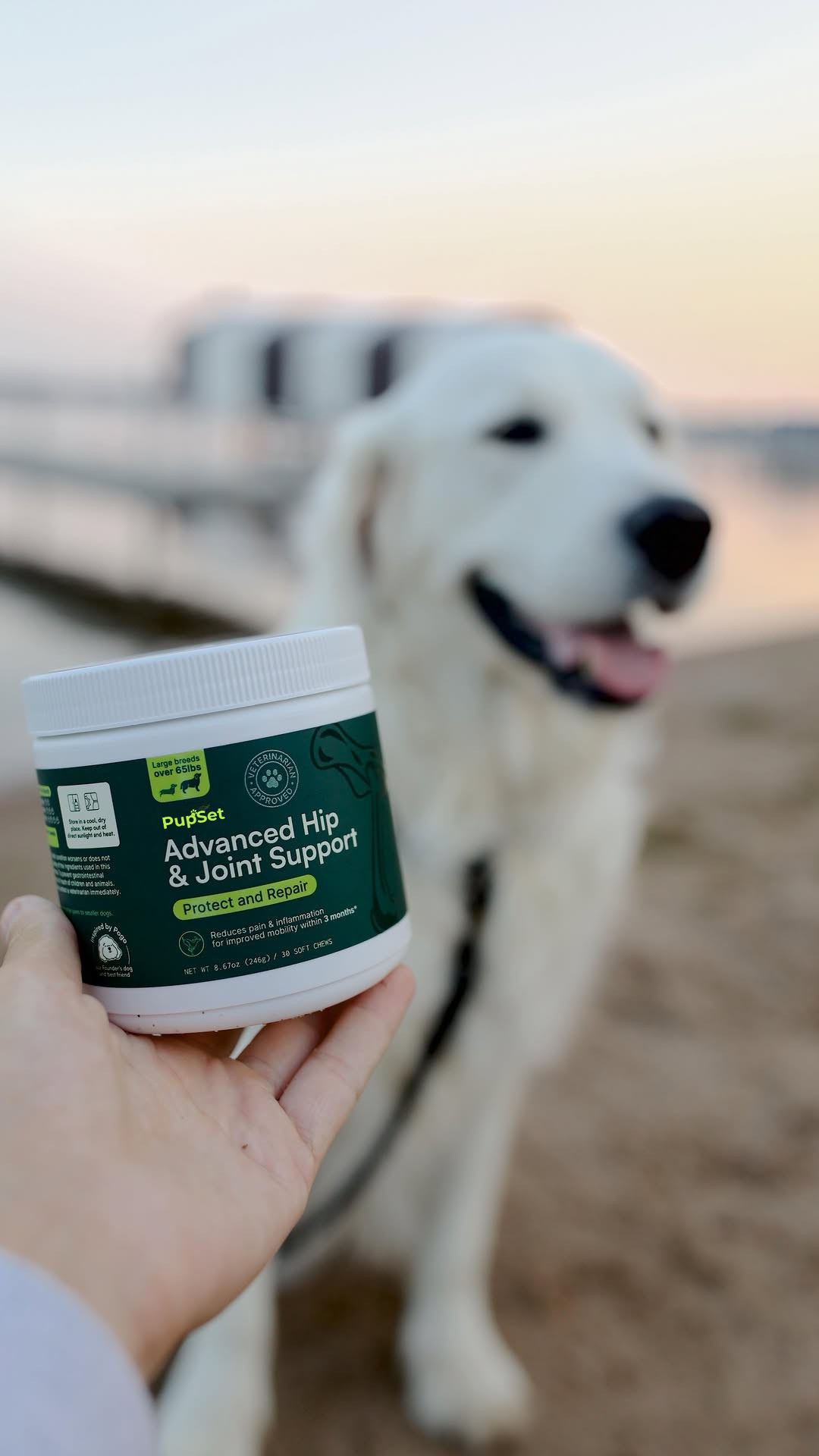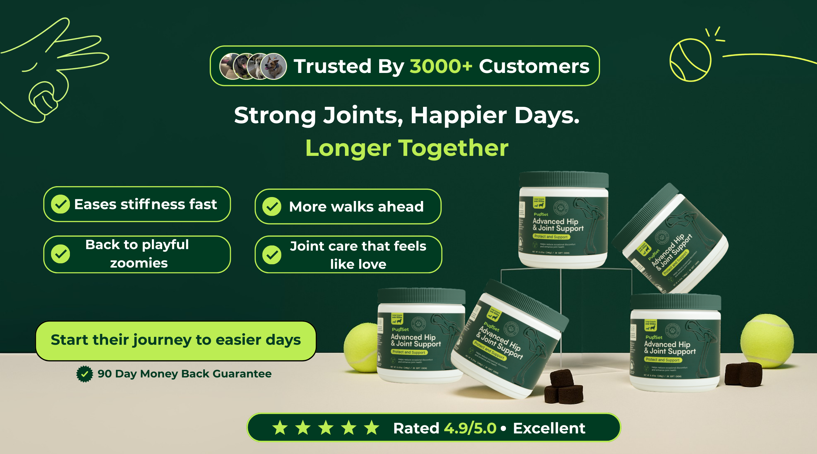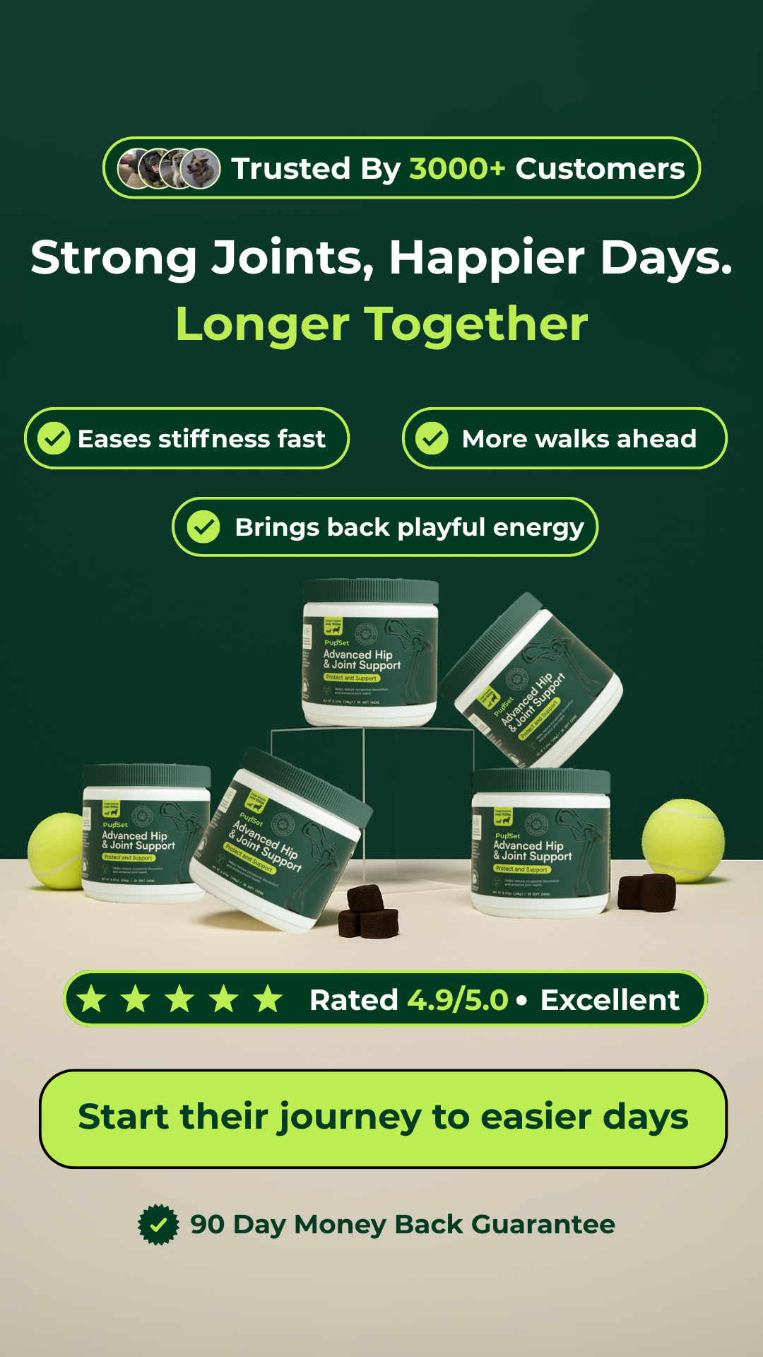 Pupset supports joints so he can move, play, and smile longer. Simple routine, transparent ingredients, visible results.